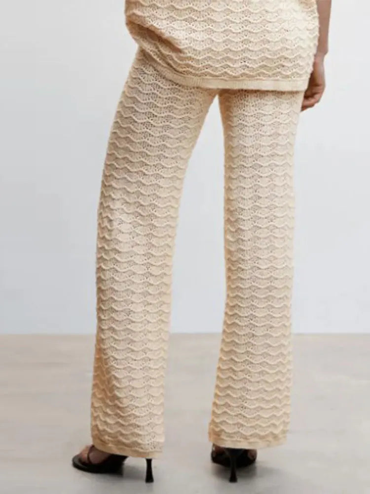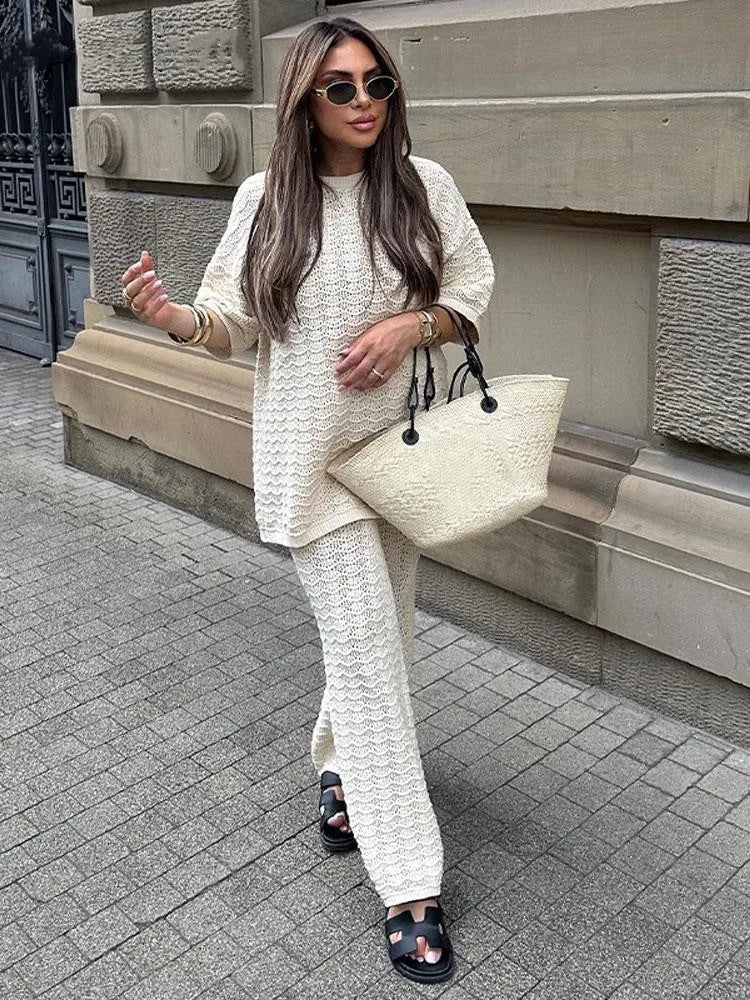 Casual elegantie: De Aurelia set bestaat uit een casual O-hals shirt met korte mouwen en een bijpassende broek, een mix van comfort en stijl die perfect is voor elke relaxte gelegenheid. Het gehaakte gebreide ontwerp voegt een unieke, ambachtelijke touch toe die deze set onderscheidt van gewone vrijetijdskleding.