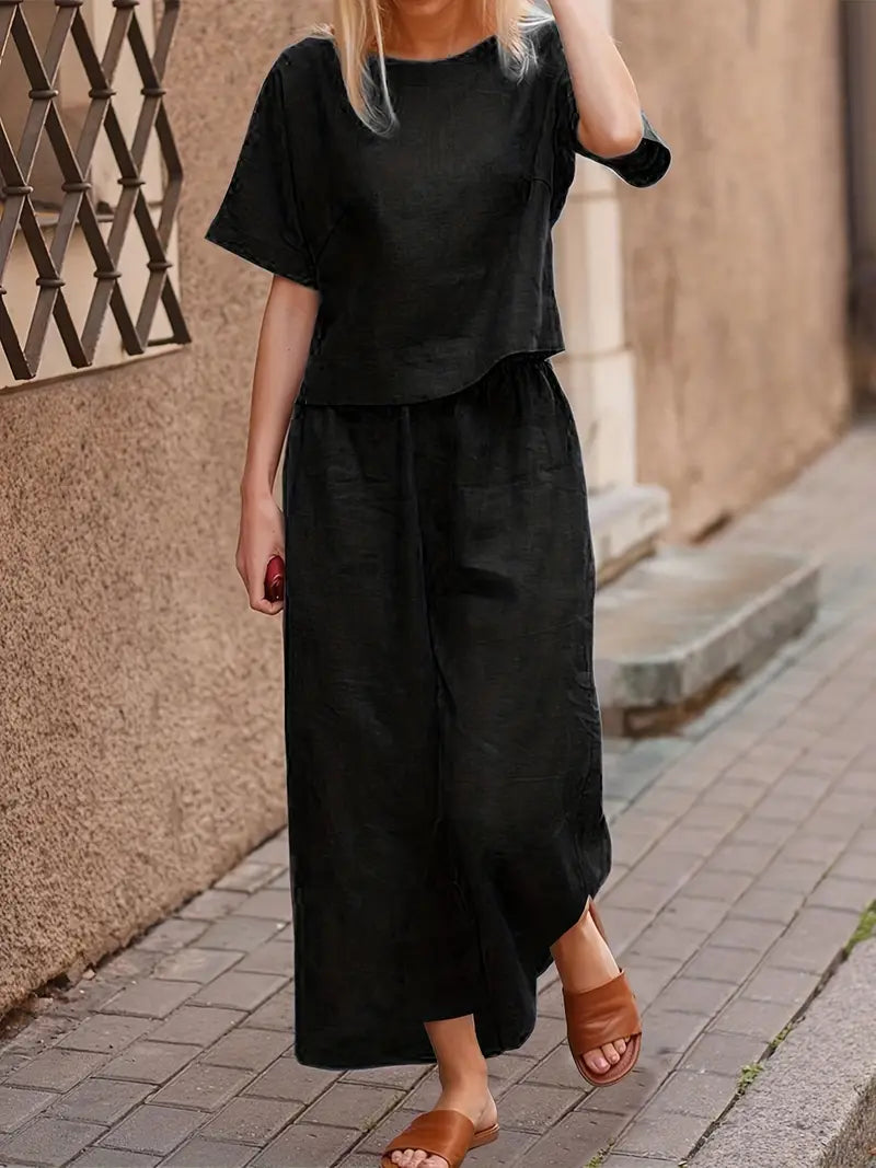 Effen, eenvoudig tweedelig T-shirt met ronde hals en korte mouwen en broek met wijde pijpen