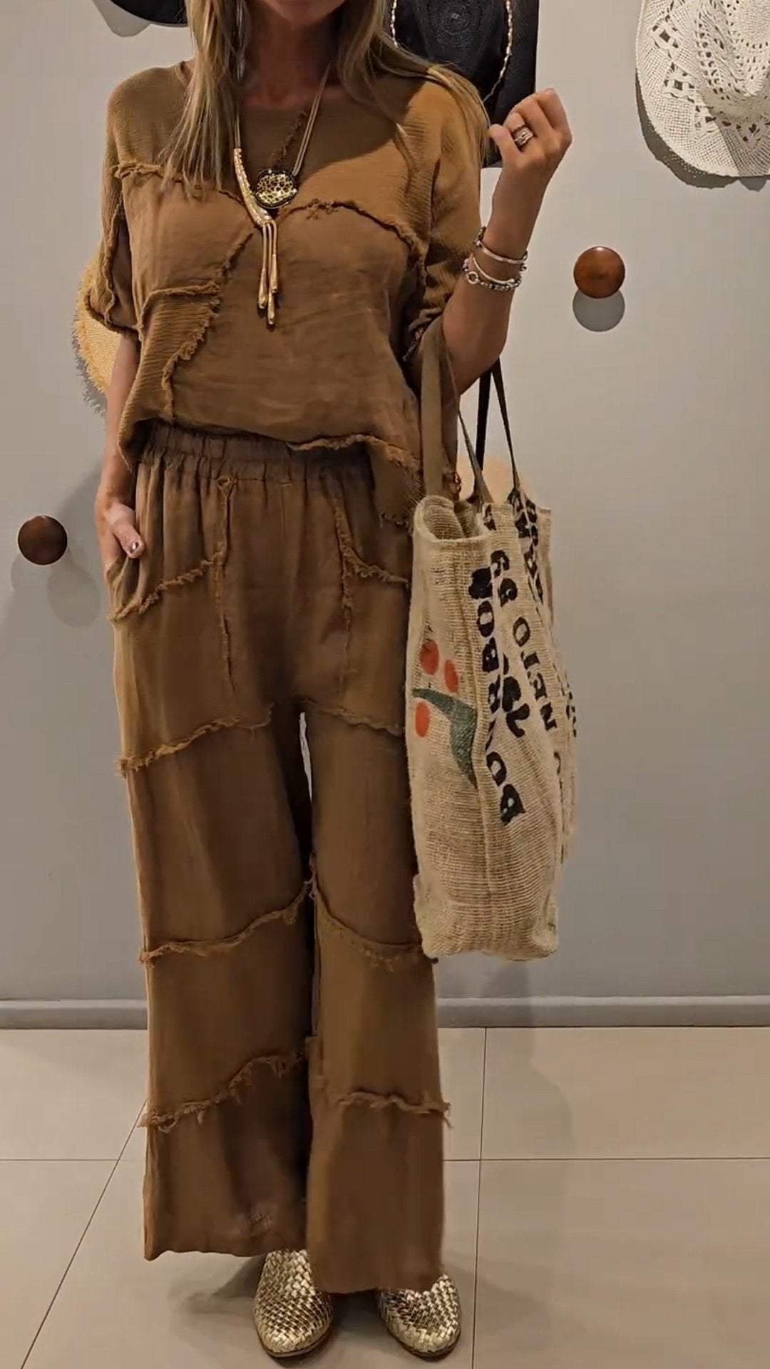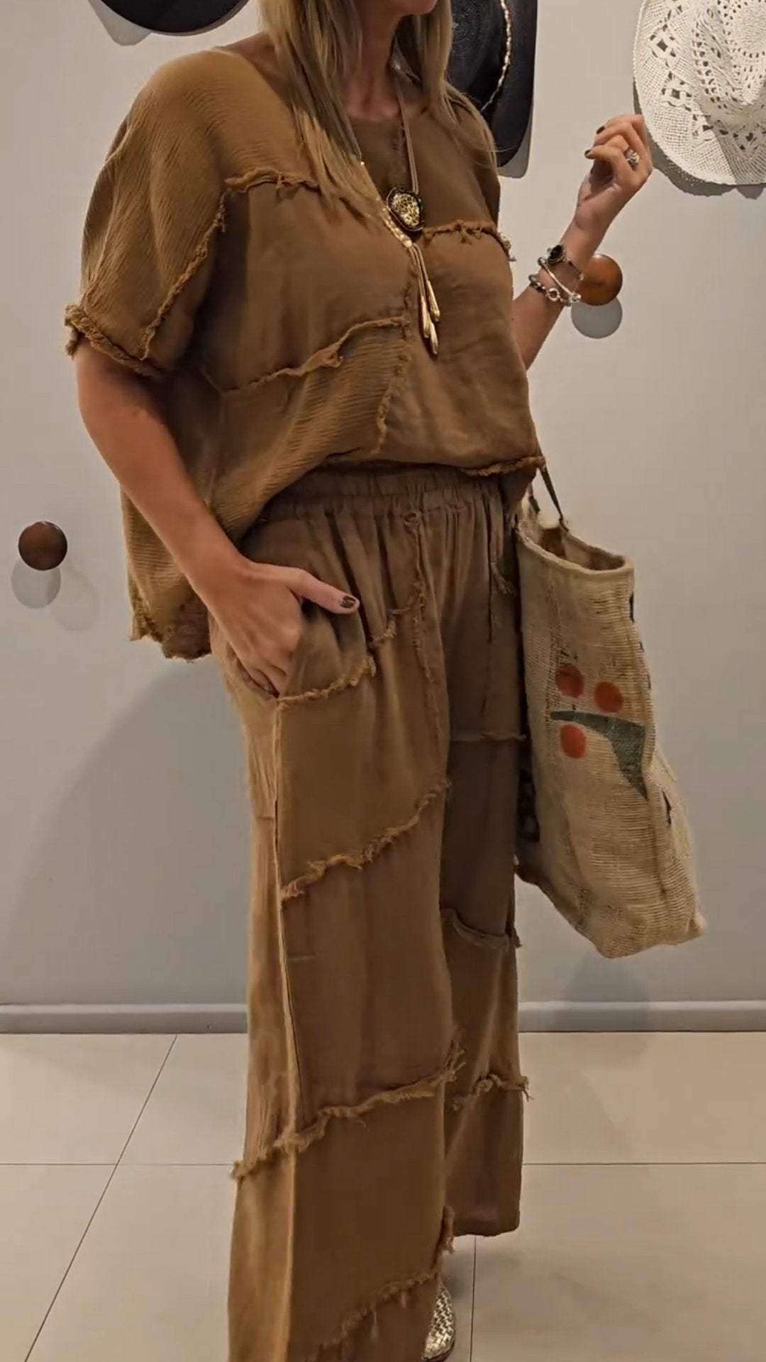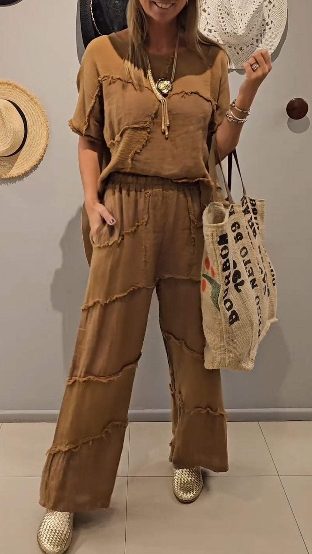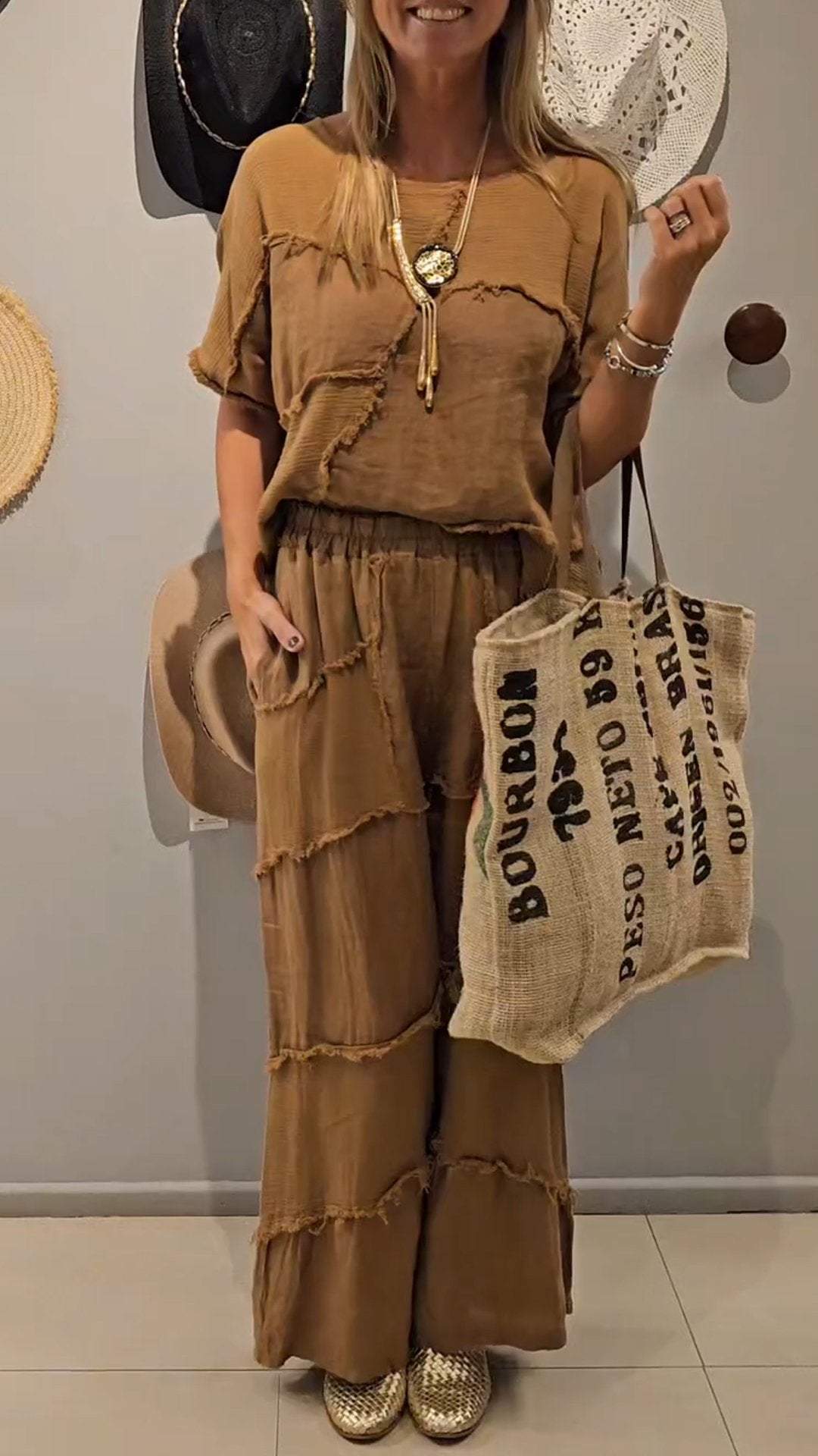 Ontketen moeiteloze elegantie met de Yani tweedelige set, gemaakt van een mix van katoen en linnen voor luxueus comfort en ademend vermogen. Verhoog je alledaagse look met het unieke splicing-ontwerp, waardoor stijl en verfijning naadloos in elkaar overgaan.
